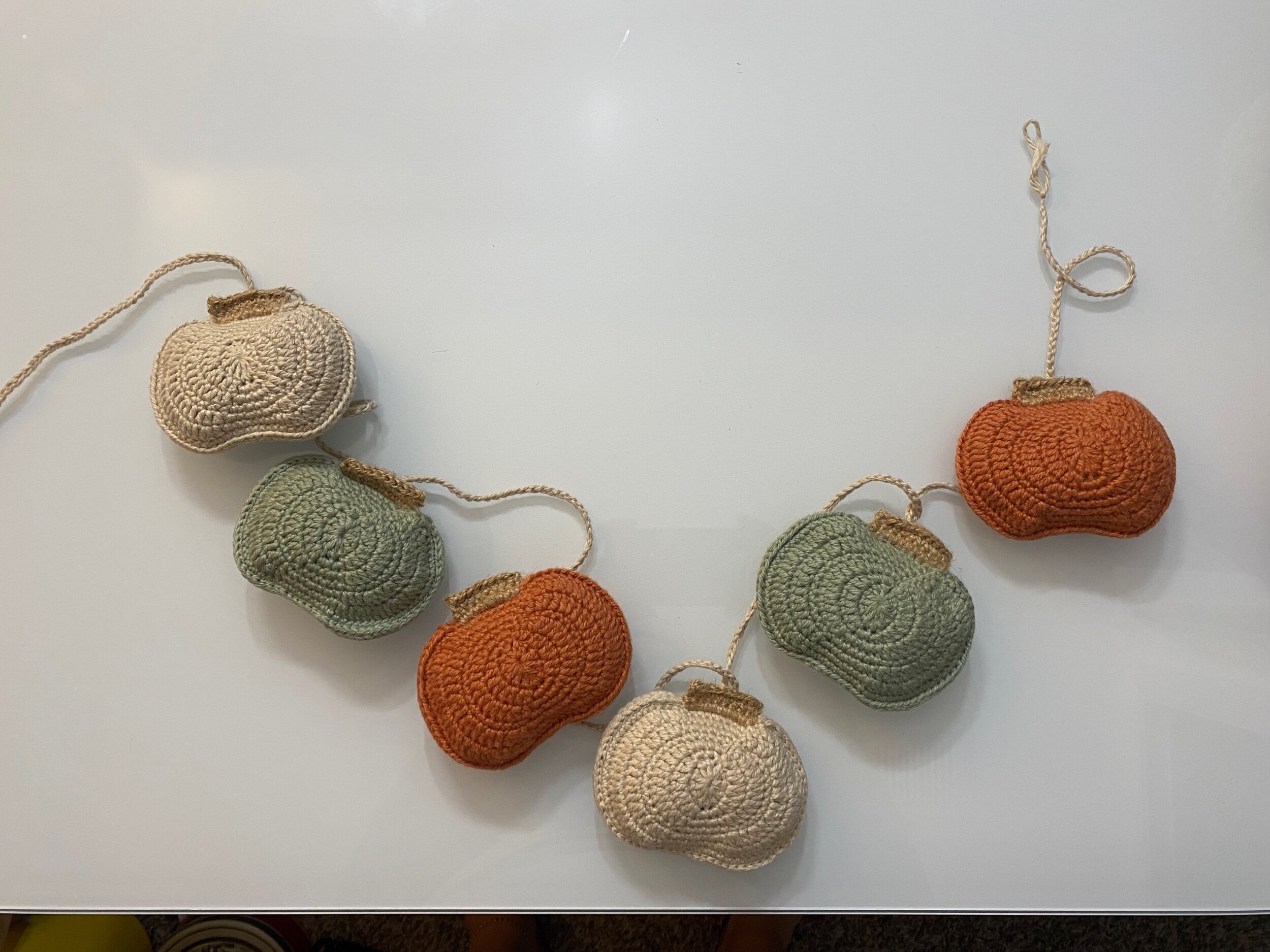 Image 1 of 2 Image 2 of 2 Pumpkin Garland $17.50 Made with 100% cotton. Each pumpkin is 4”, 6 total. Add To Cart Added! Made with 100% cotton. Each pumpkin is 4”, 6 total.