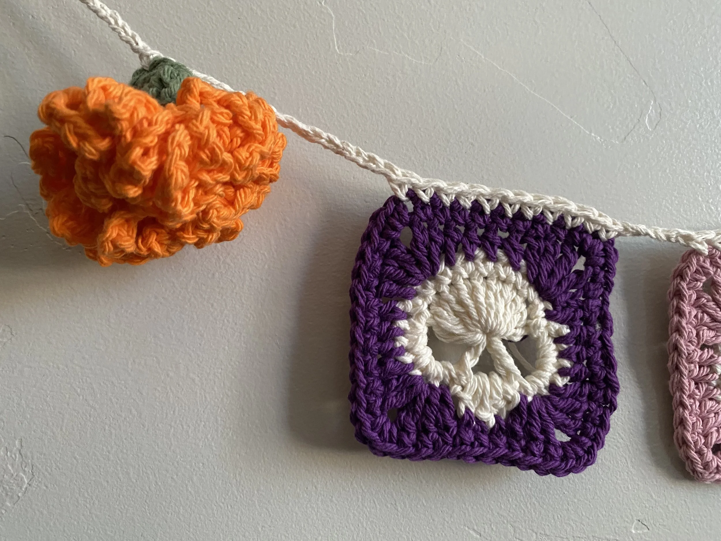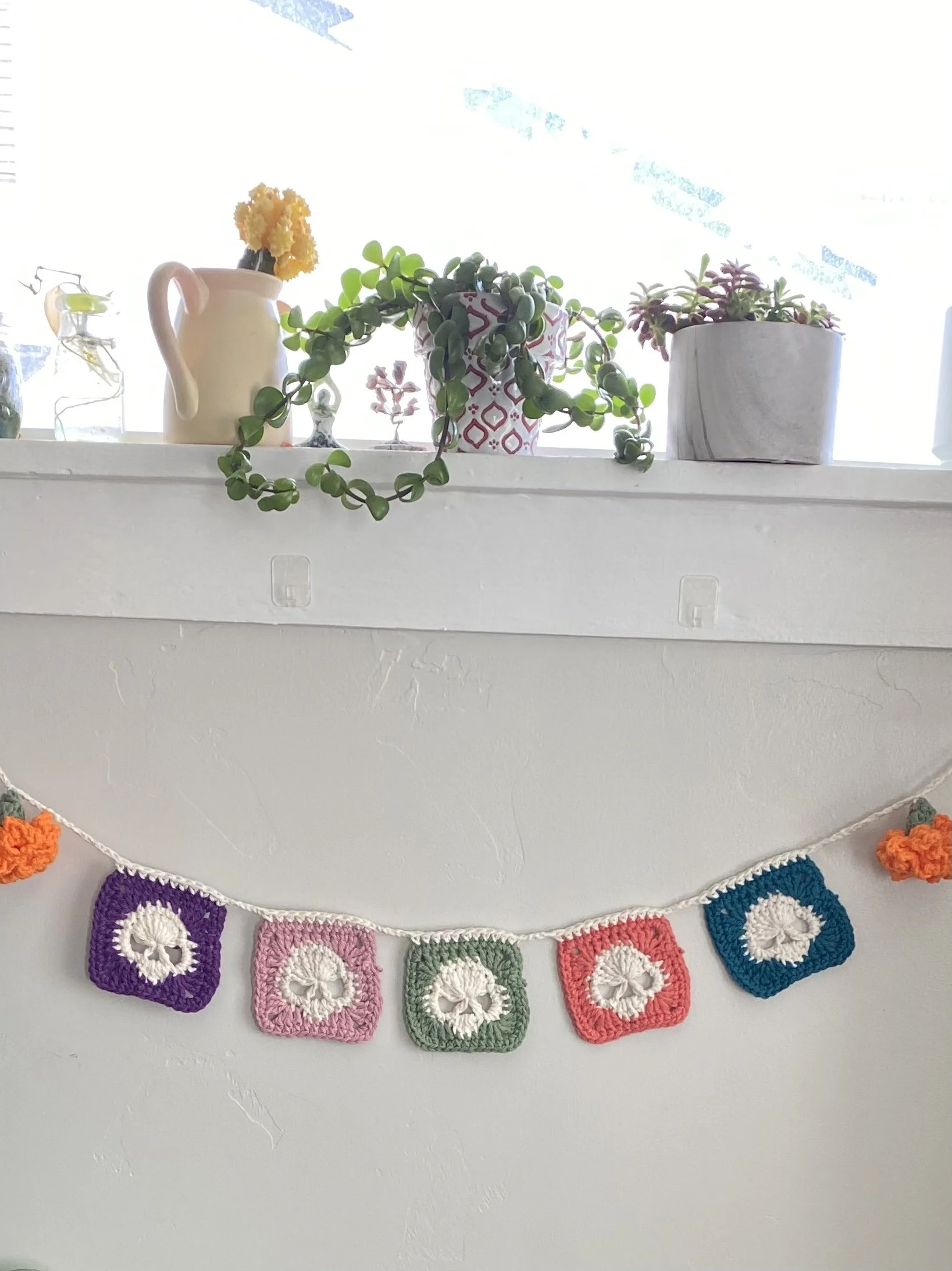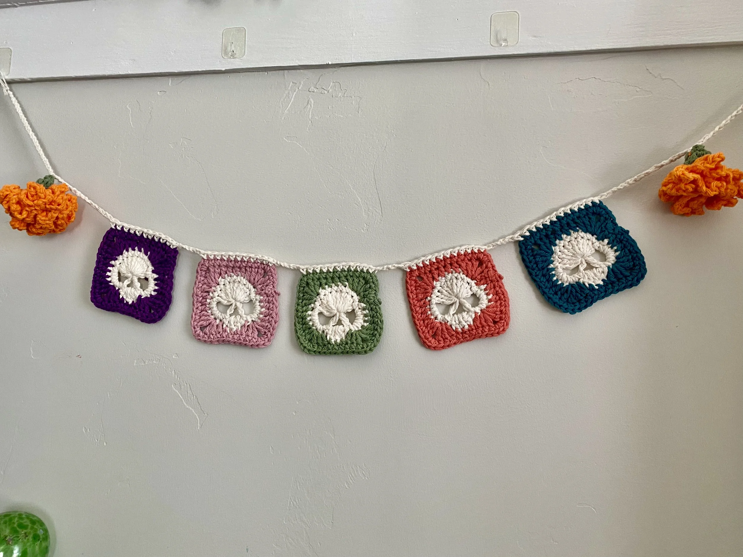 Image 1 of 5 Image 2 of 5 Image 3 of 5 Image 4 of 5 Image 5 of 5 Día de los Muertos Garland $17.50 Made using 100% cotton yarn with five skull granny squares & two marigold flowers. Quantity: Add To Cart Added! Made using 100% cotton yarn with five skull granny squares & two marigold flowers.